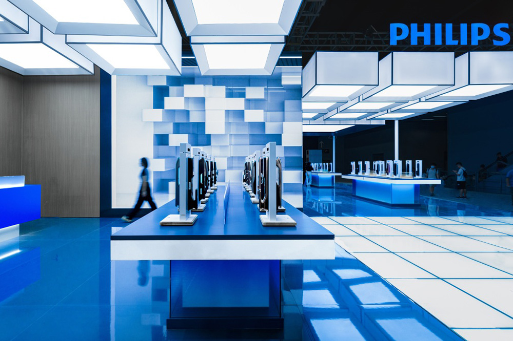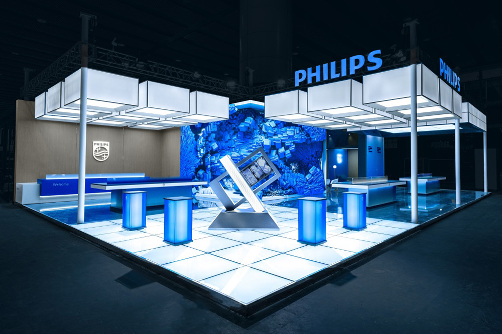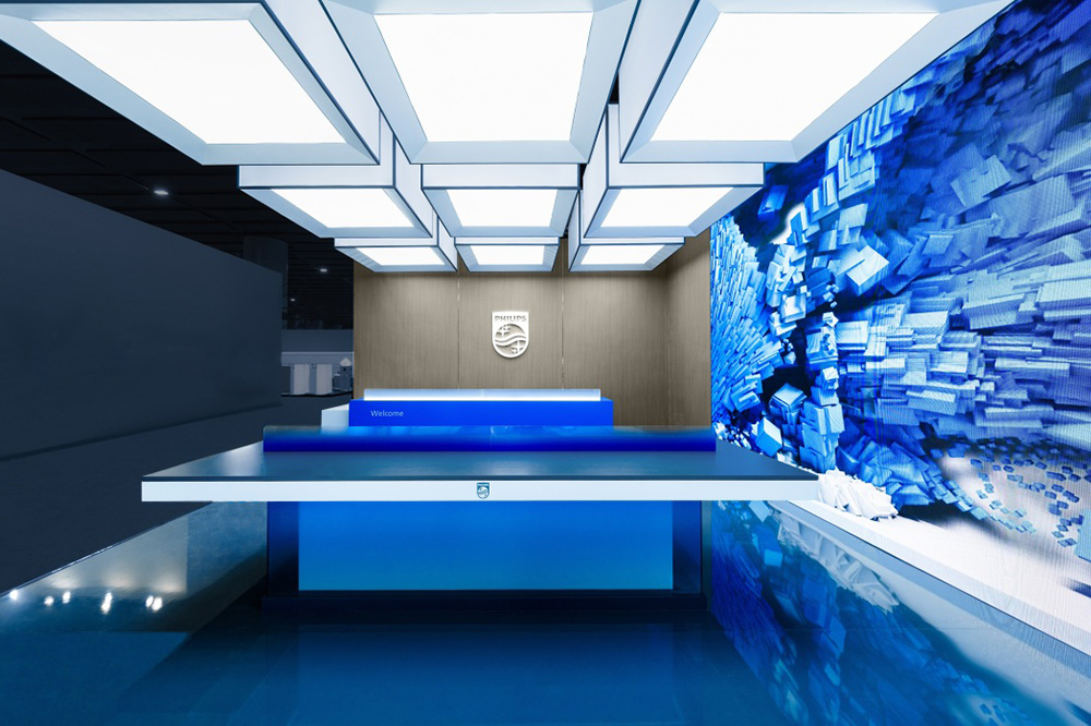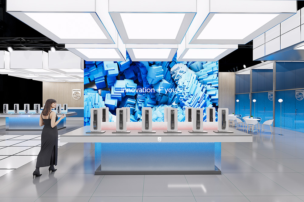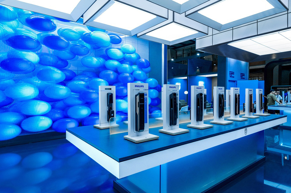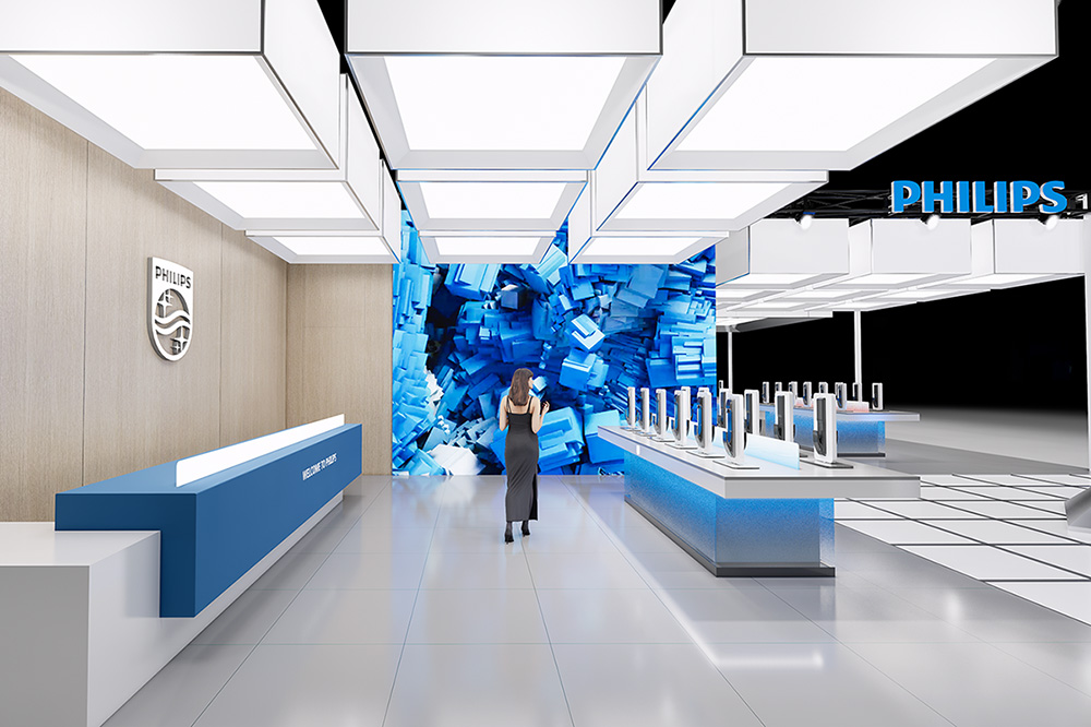 The overall space adopts an open and transparent layout. Philips' signature blue, paired withsimple whites and grays, forms the primary color palette, creating a bright, professional, and futuristic atmosphere. The entrance features a prominent "PHILIPS" brand wall and a "Welcome" greeting, providing strong visual guidance and conveying an open and welcoming stance. Inside, carefully designed homescenographic display areas—such as realistic settings of living rooms, kitchens, and bedrooms—visually demonstrate how Philips products, through intelligent and user-centric design, empower healthy, comfortable, and convenient daily life.